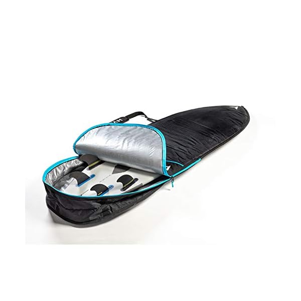 Robustes 10mm gepolstertes Boardbag für ein Surfboard, ideal für Flugreisen. Mit silbernem Reflective Shield Polytarp Shell und robustem ripstop Nylon auf der anderen Seite